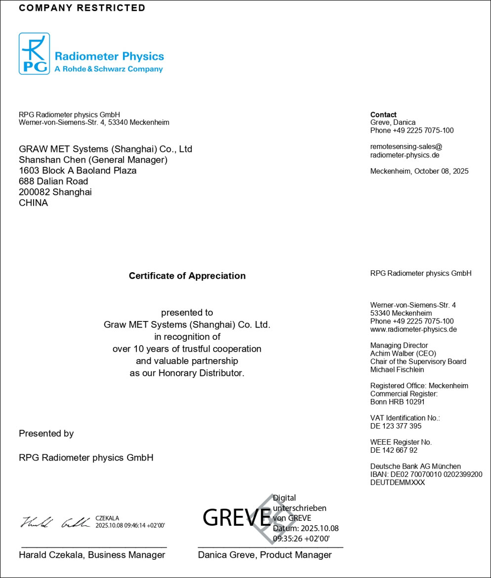 正是凭借这种将国际顶尖技术“无缝落地”的硬实力,以及始终以客户为中心的服务理念,上海歌劳赢得了RPG的高度信赖,最终被授予象征深度合作的 “荣誉经销商证书(Certificate Honored Distributor)” 。